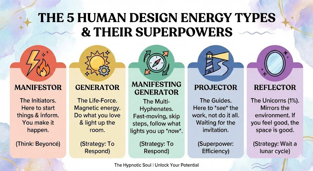 Think of it as the cosmic user manual you wish you had been handed the day you were born. It’s the energetic blueprint that explains why some people can hustle 24/7 and feel energized, while others (hi, Projectors!) need a nap after a two-hour Zoom call.